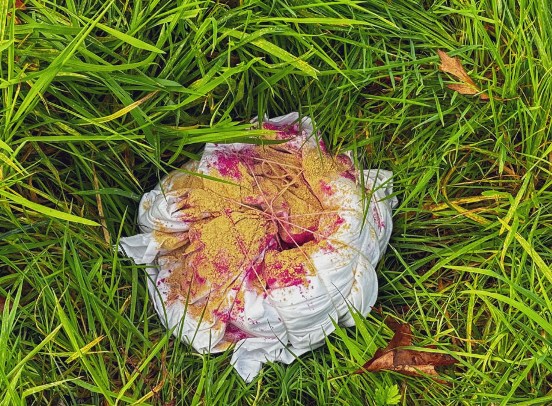 Nadat Marloes alle doeken heeft geplaatst op het grasveld, moet ze wachten op de eerste resultaten. Zo ver is het alleen nooit gekomen. Als ze twee weken later terugkeert om de experimenten te bekijken, blijkt dat alles is weggehaald. Er is geen doek meer te bekennen op de 49m2. Slechts de contouren van het vierkanten frame en een zweem van roze pigmenten zijn nog zichtbaar in het gras. Verder is er niets meer. In eerste instantie overheerst de teleurstelling over het ontbreken van haar experimenten op het 49m2-grasveld. ‘Maar,’ vertelt Marloes, ‘toch was ik niet verbaasd dat het weg was. Ik vind het wel jammer, maar ik ben er niet boos over. Wat me vooral bezighoudt is de realisatie dat ik als kunstenaar zelfs deze plek die ik toegewezen heb gekregen, niet mag innemen. Wat je als kunstenaar maakt is blijkbaar in de ogen van anderen toch een soort troep die opgeruimd moet worden. Ik blijf me afvragen: als er zelfs hier op dit grasveld geen ruimte is voor mijn werk, waar dan wel?