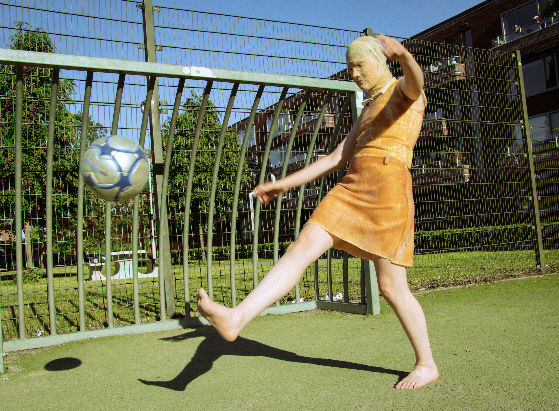 In een latex uitgaansoutfit met bijbehorend latex masker trapt Floor Faes tegen een voetbal. Met het been omhoog is haar latex rok goed zichtbaar – mooi voor een avond uit, minder praktisch op het voetbalveld. Een tweede foto toont haar zittend op een terras in voetbaltenue, wederom met het kenmerkende masker op haar hoofd en lange latex sokken aan de voeten.